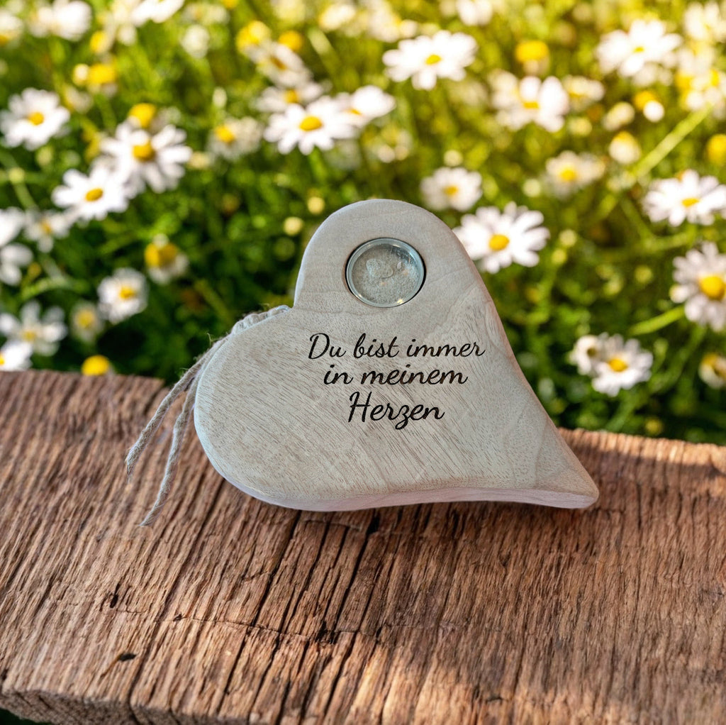 Erinnerungsherz aus Holz, zum Stehen oder Anhängen mit Medaillion und Gravur